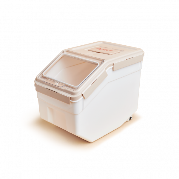 Pratico contenitore per alimenti secchi che può contenere fino a 5 kg di cibo. Si possono così riporre facilmente i sacchi grandi in cantina e avere sempre il pratico contenitore piccolo a portata di mano in cucina.