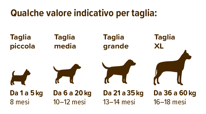 Più il caneè di taglia piccola, più rapidamente cresce e si può passare all’alimentazione per adulti.